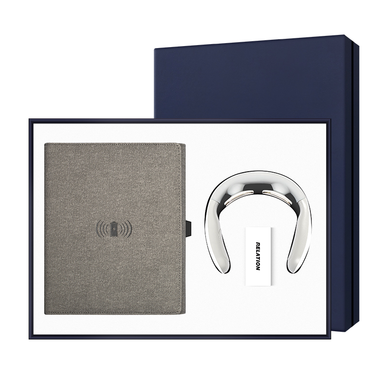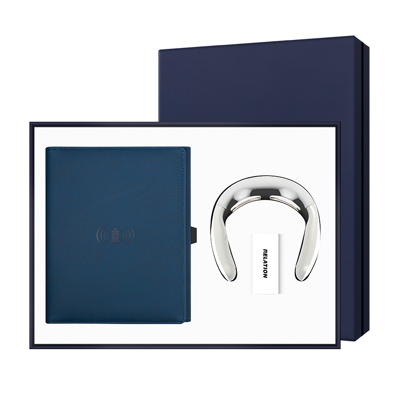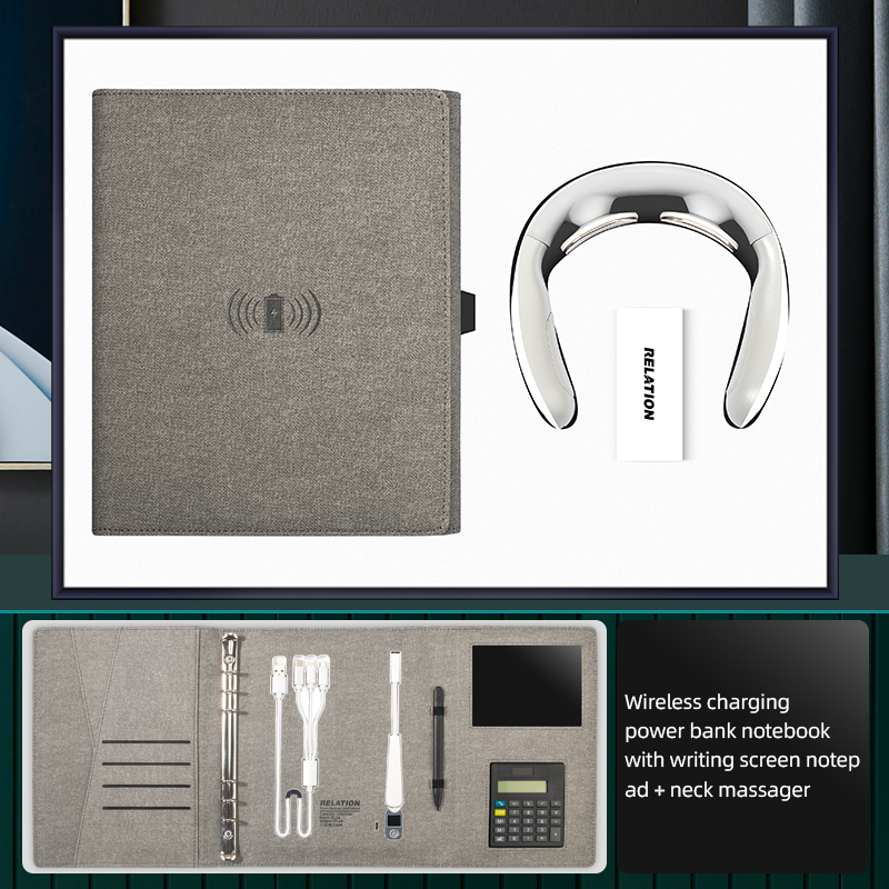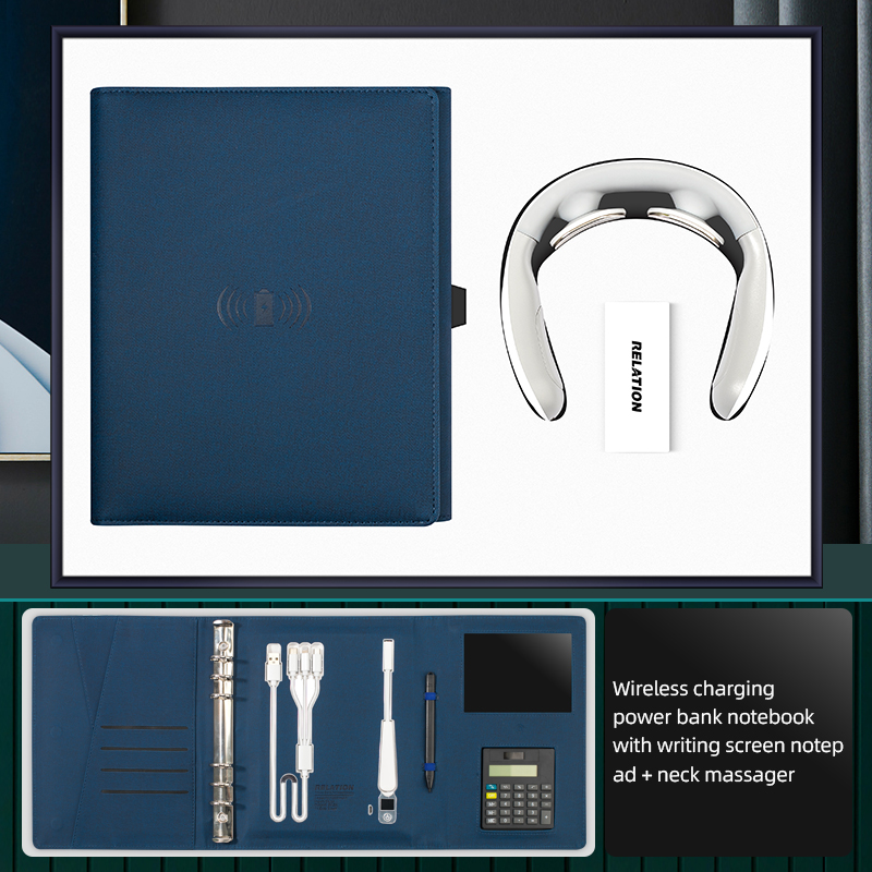 Power bank notebook:Small writing screen notepad, wireless & cable charging, LED lamp, calculator,storage, 12000mahNeck massage:4 massage modes & 15 levels, low pulse, constant temperature hot compress, 2.5W, 150*145*45mmColor:Blue, gray