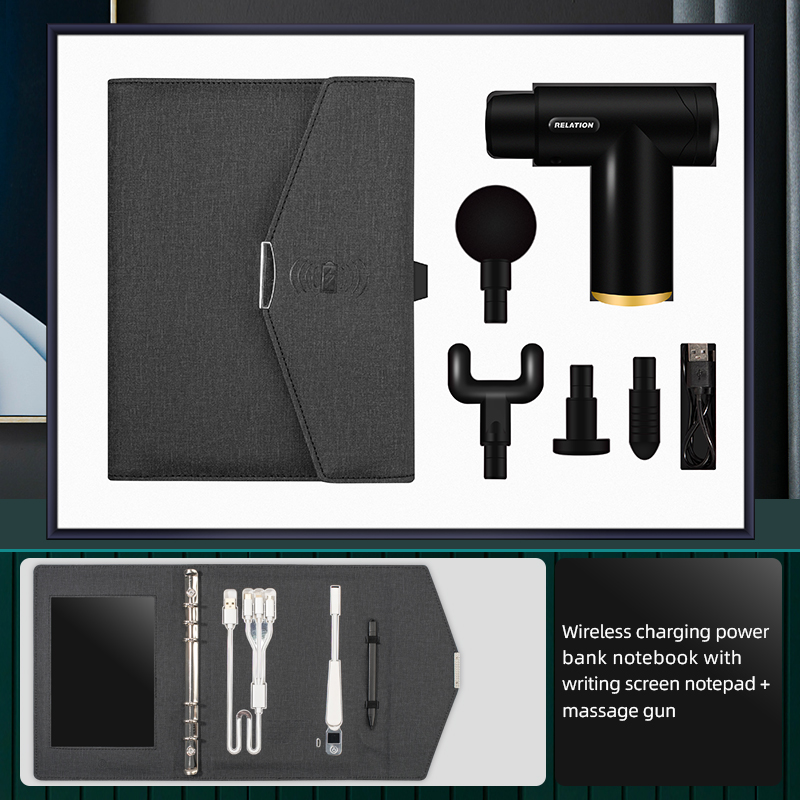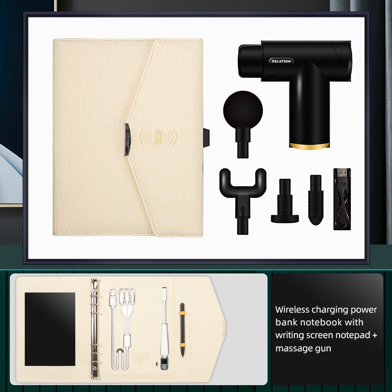 Power bank notebook:Big writing screen notepad, wireless & cable charging, LED lamp, storage, 12000mah Massage gun:132*134*50mm(excluding massage tool), four kinds of massage tools, 1800mAh, Type-C input port Color:Black, beige