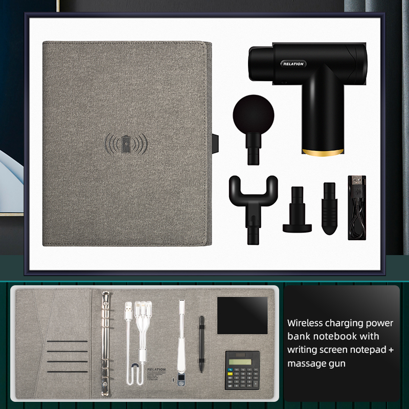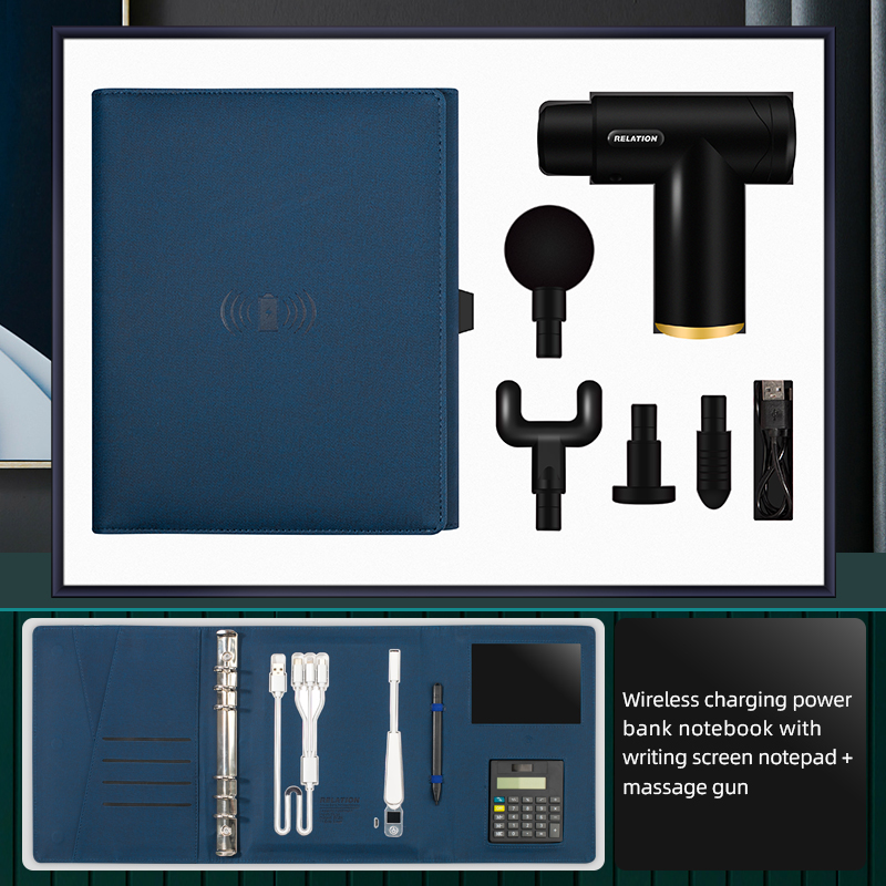 Power bank notebook:Small writing screen notepad, wireless & cable charging, LED lamp, calculator,storage, 12000mah Massage gun:132*134*50mm(excluding massage tool), four kinds of massage tools, 1800mAh, Type-C input port Color:Blue, gray