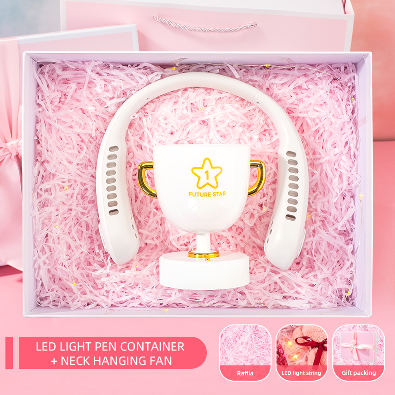 Hanging neck fan:1200mAh, 4.5-6.5V, 3-7W, 5 wind speeds, led screen, runway shape design wind outlet, 20*20cm, micro usb chargingTrophy Night Light Pen Holder: