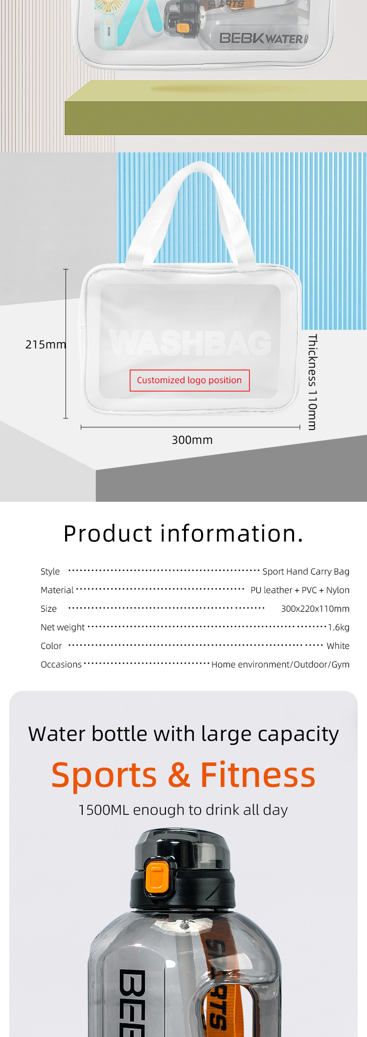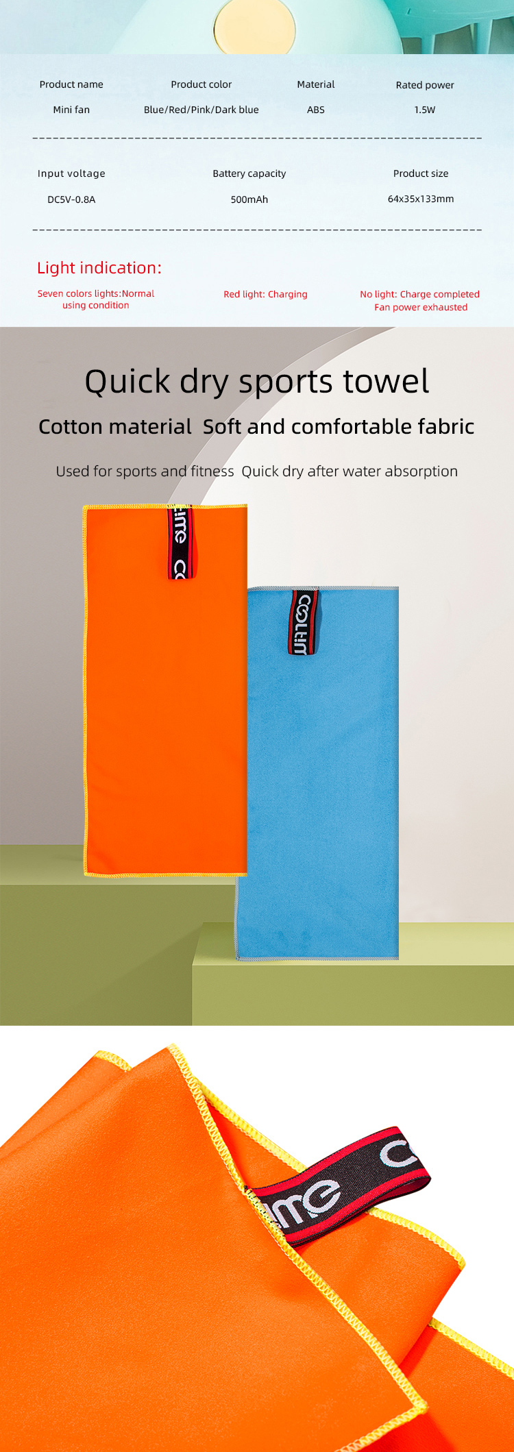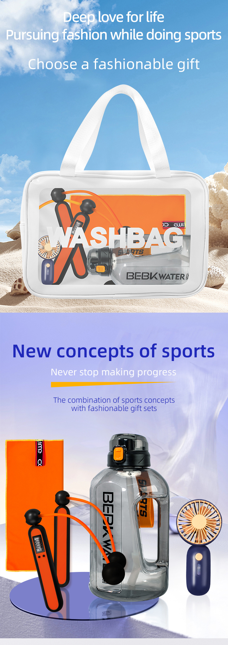 Quick-dry towel:Orange, blue,80*40mm, Microfiber double-sided velvet, 70g Skip Rope:Orange, blue, Hand grip length: 170*27mm, rope length: 280cm, PVC+ABS, Intelligent count, screen display Sports cup:Gray, With a straw and handle, PC+PP, 1500ML, 240*126mm, One button to open Mini fan:Blue, ABS material, 3 wind speeds, 64*35*133mm, with light indicator Wash bag:White bag with handle,215*300*110mm, PVC+PU leather+nylon, with zipper Color:As picture