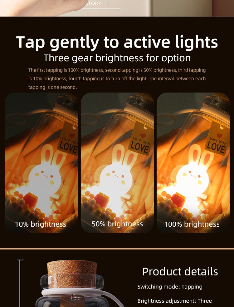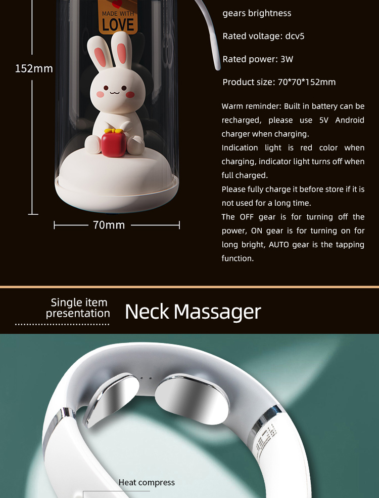 Atmosphere LampRechargeable, usb input, auto mode: 100%-50%-10%-off brightness auto changing; on mode: 100% brightness, with lanyard, 70*70*152mm, DC5V, 3W