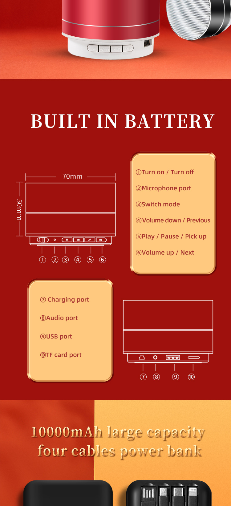 Bluetooth, 1 usb input port, 1 TF card insert, 1 micro usb charging port, functional buttons
