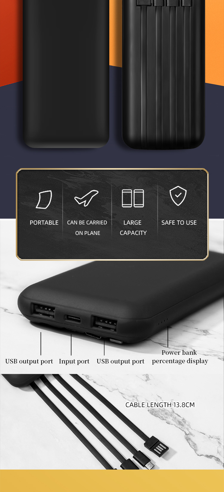 10000mAh, 4 lights power indicator with lightning, type-C & Micro usb charging cables, USB input charging cable, two USB output ports, one type-C input port, four lights power indicator