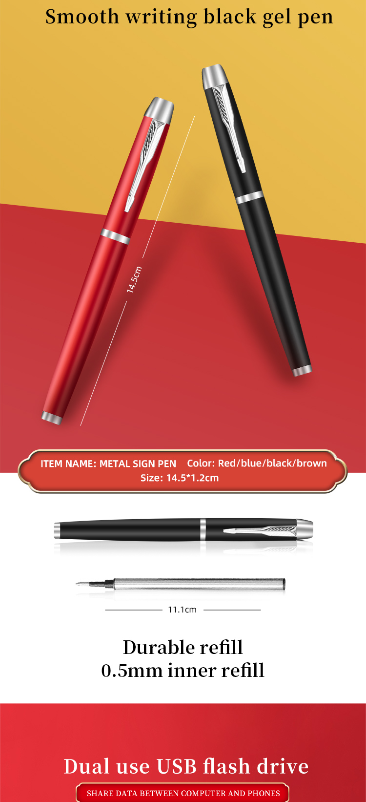 Metal, round, black gel ink