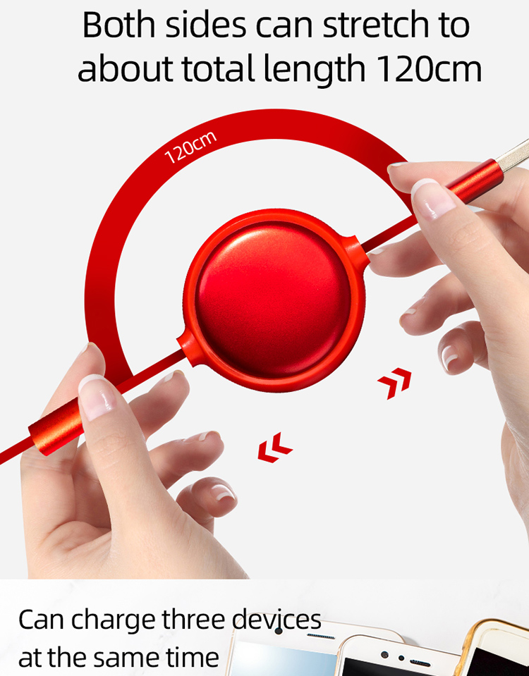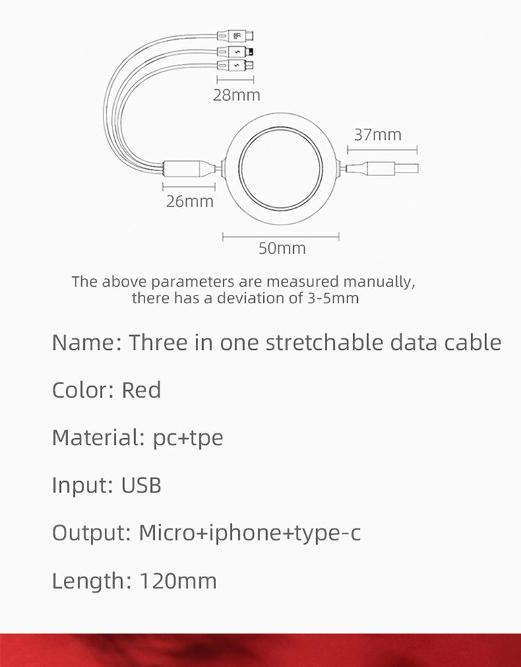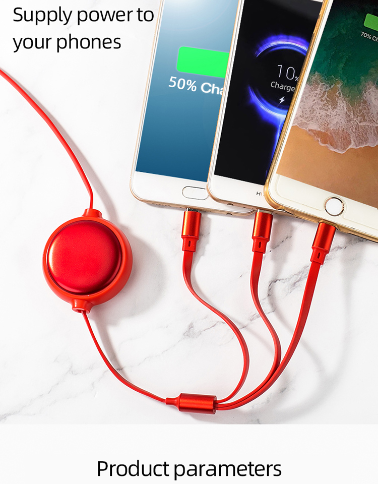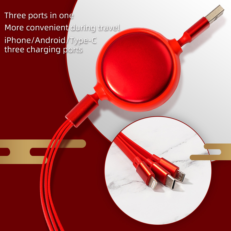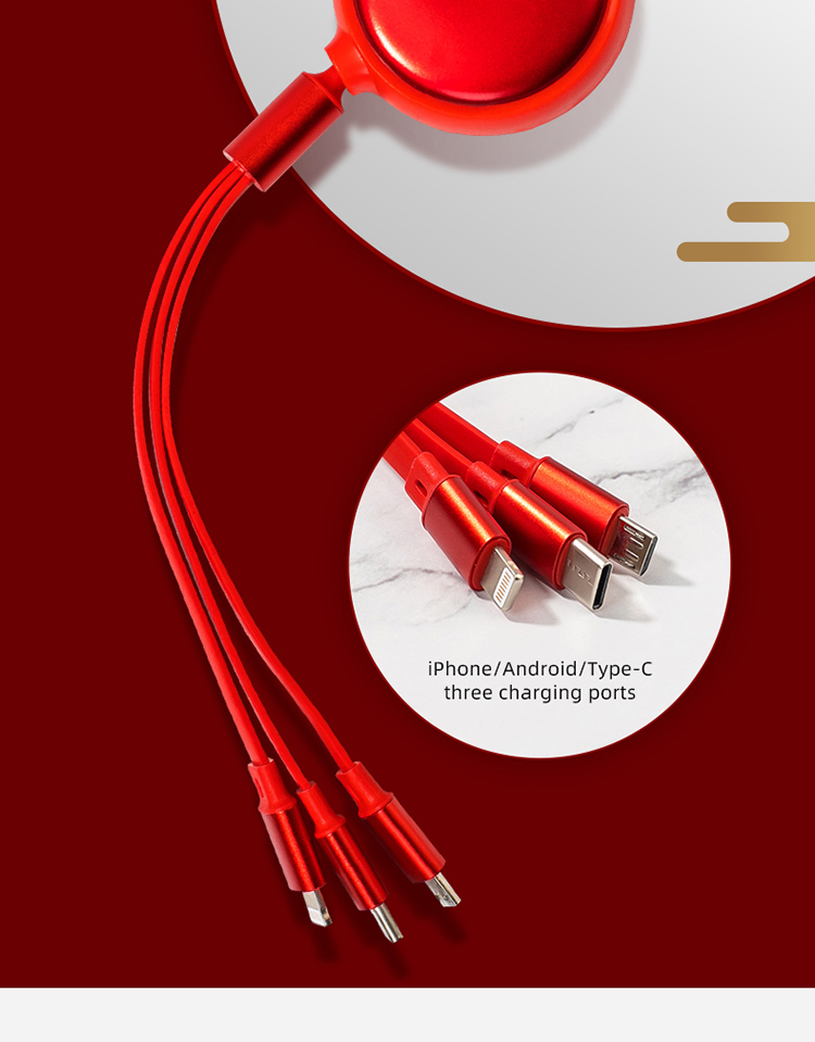 USB cablePC+tpe material, output port: iPhone, micro USB, Type-C; length can extend to 3000px