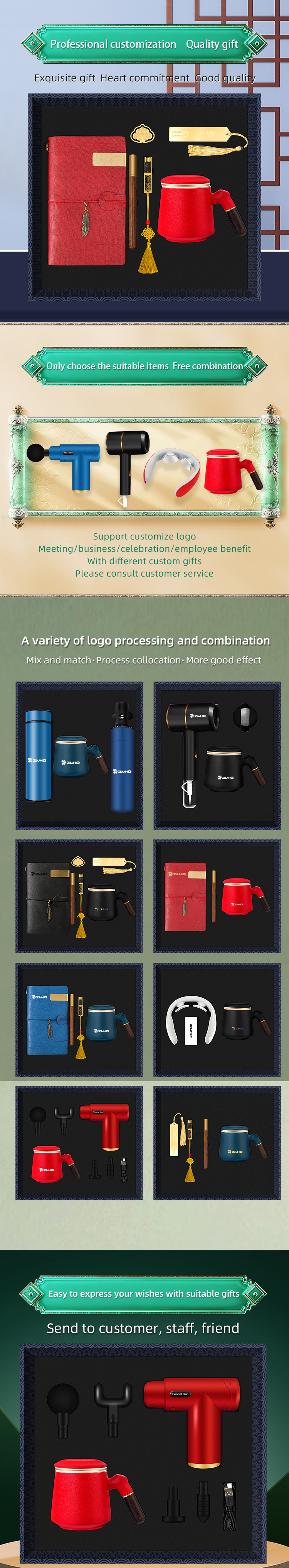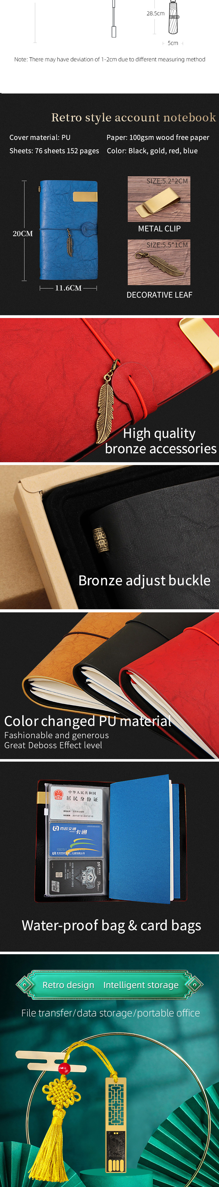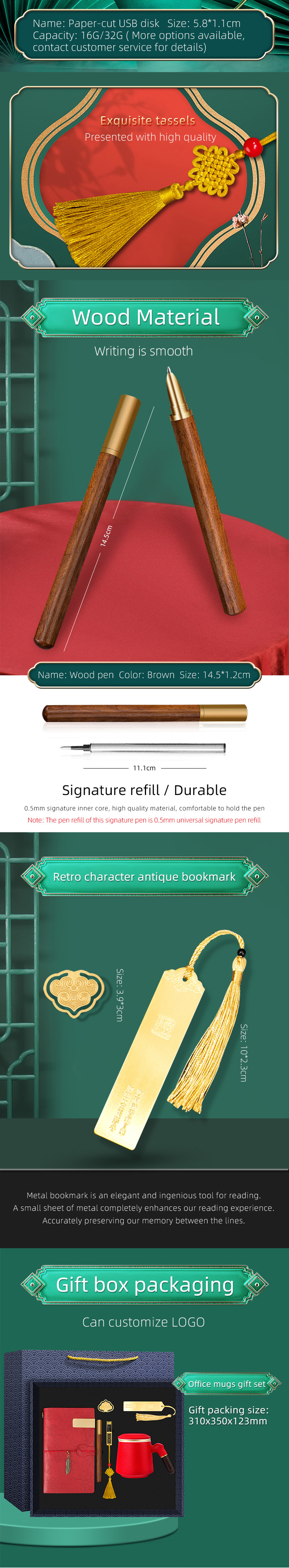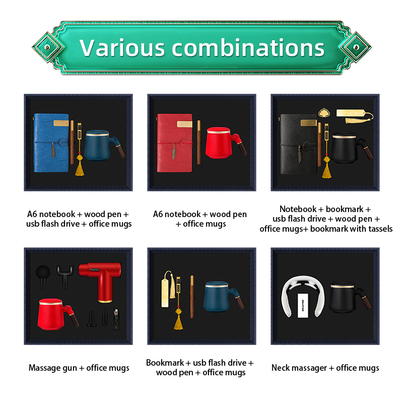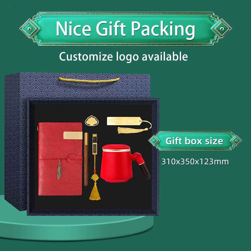 Notebook:A6, 2 sets inner blank sheets, 76 sheets, with metal clip & pendant Pen:Brass wood body, metal cap, black gel ink tea mug with infuser:350ml, 14*10.5cm, ceramic & wood, with tea infuser Color:Red, blue, black