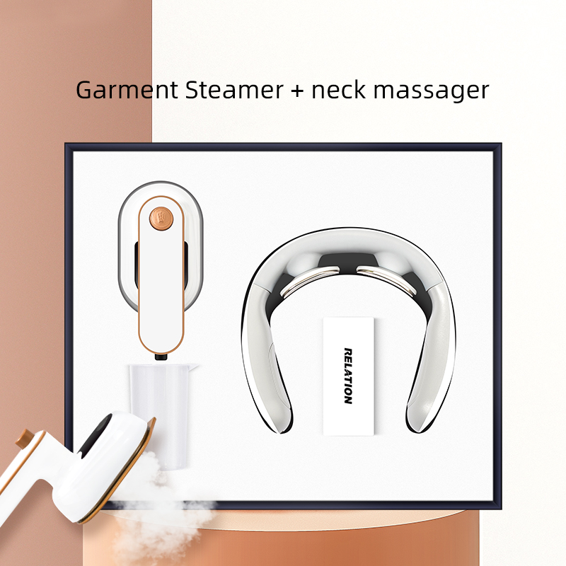 Clothes steamer:12.8*6.2*8.4cm, dry and wet ironing, 170℃ constant temperature, voltage:220V, 50Hz. Power supply: Plug-in use.Neck massage:4 massage modes & 15 levels, low pulse, constant temperature hot compress, 2.5W, 150*145*45mmColor:white