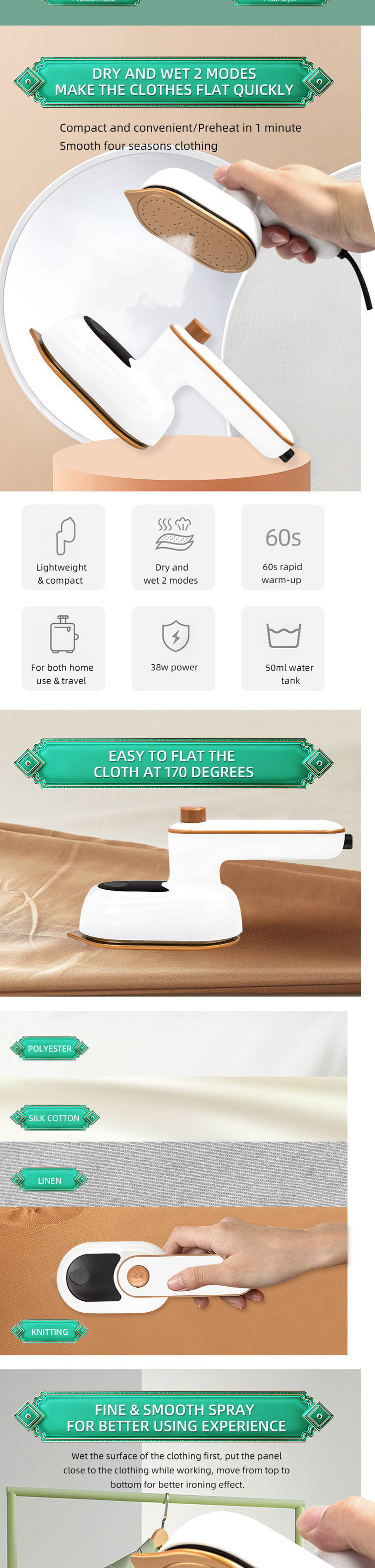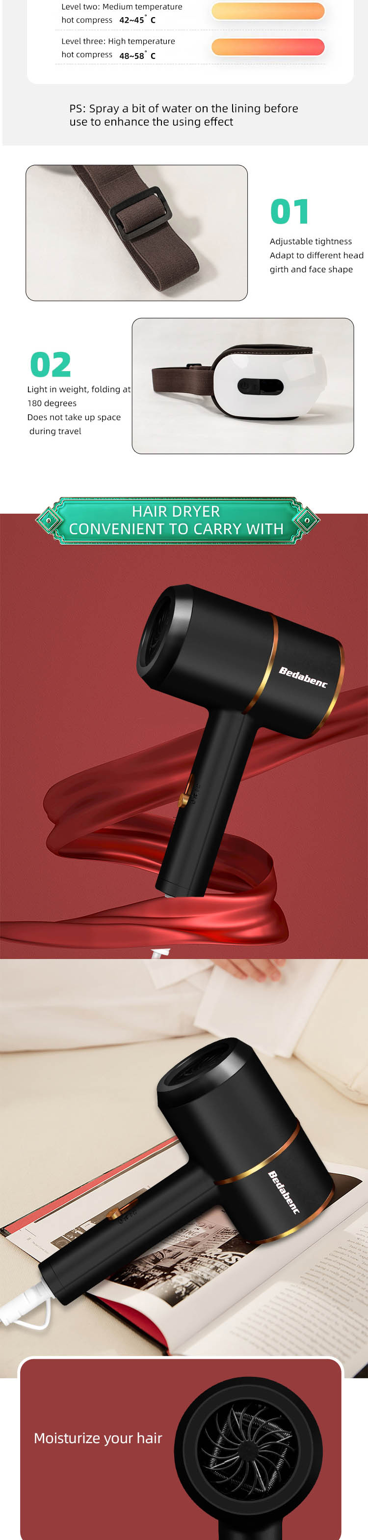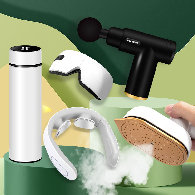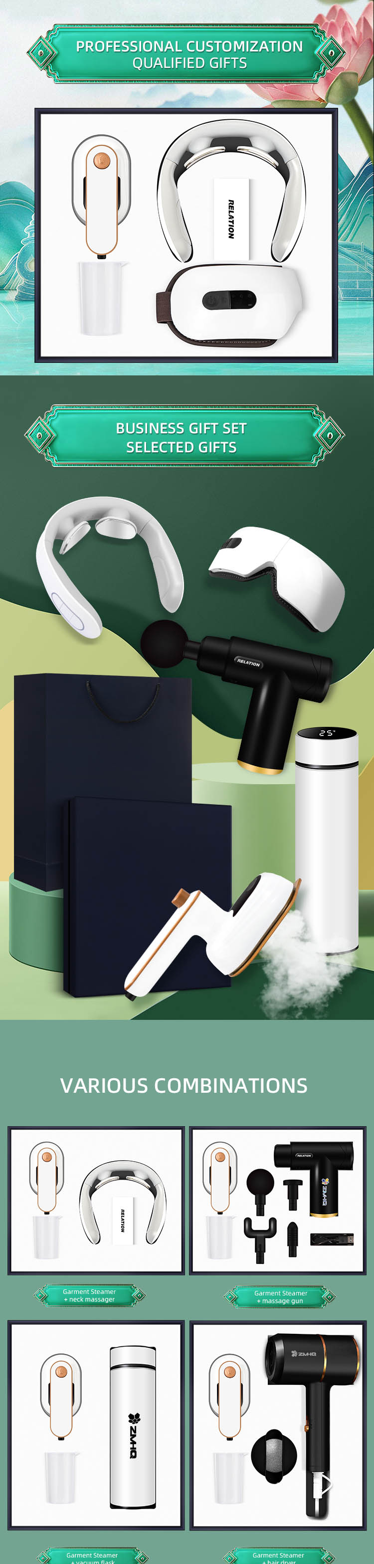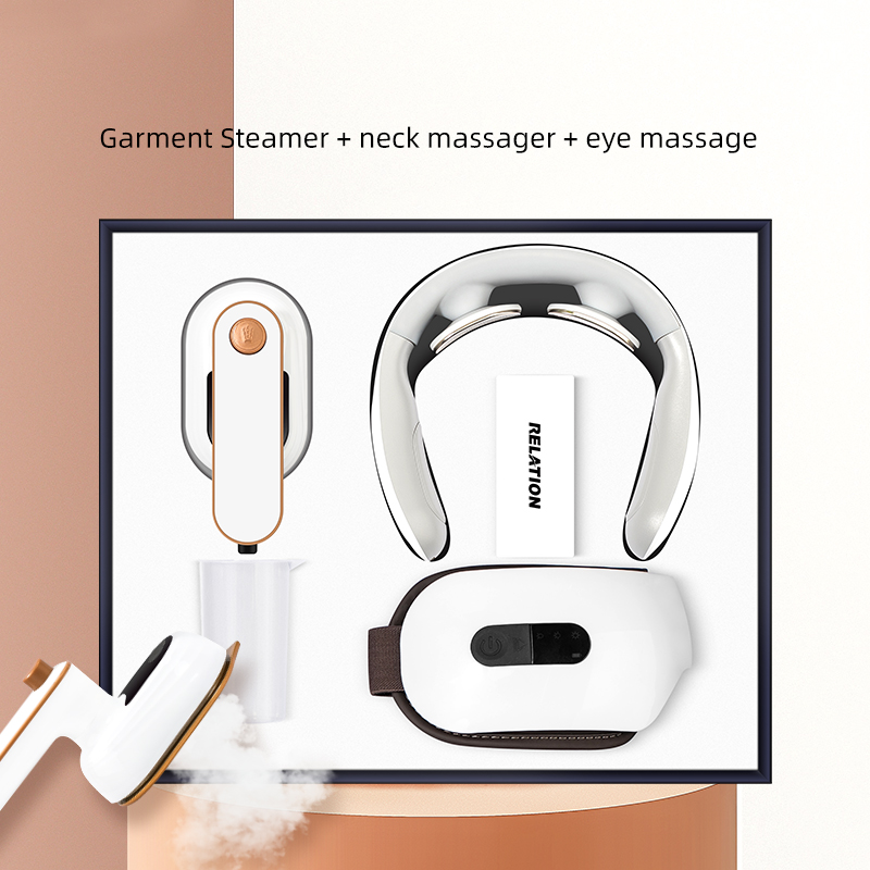 Clothes steamer:12.8*6.2*8.4cm, dry and wet ironing, 170℃ constant temperature,voltage:220V, 50Hz. Power supply: Plug-in use. Neck massage:4 massage modes & 15 levels, low pulse, constant temperature hot compress, 2.5W, 150*145*45mmEye massager:3 levels temperature heat compressing, ABS material, with adjustable beltColor:White
