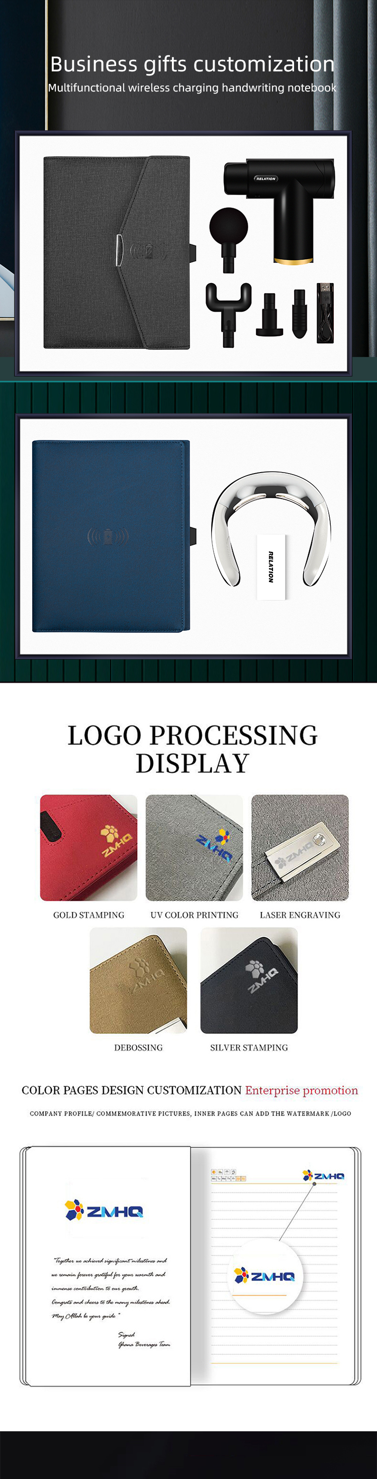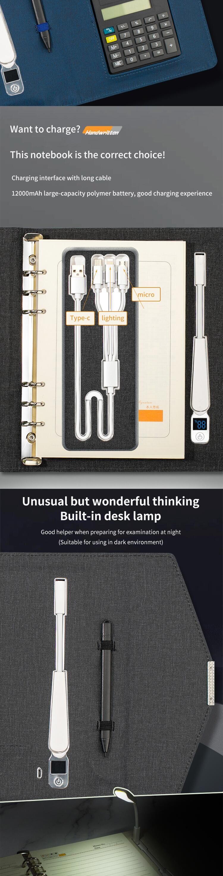 Cover size & material:A5 & PU Color:Black, beige Function:Big writing screen notepad, wireless & cable charging, LED lamp Power bank capacity:12000mAh with led light indicator Inner paper:80 sheets 100gsm wood free standard English pages Packing:Dark blue heaven and earth cover box+dark blue hand carry bag with dark blue handle