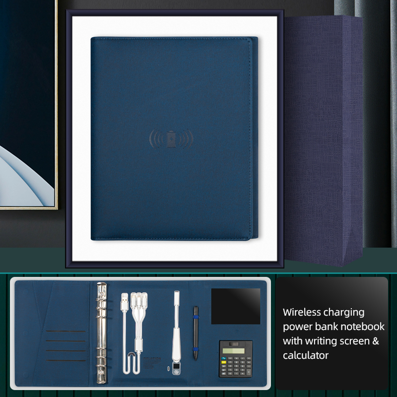 Cover size & material:A5 & PU Color:Blue, gray Function:Small writing screen notepad, wireless & cable charging, LED lamp, calculator,storage Power bank capacity:12000mAh with led light indicator Inner paper:80 sheets 100gsm wood free standard English pages Packing:Dark blue heaven and earth cover box+dark blue hand carry bag with dark blue handle