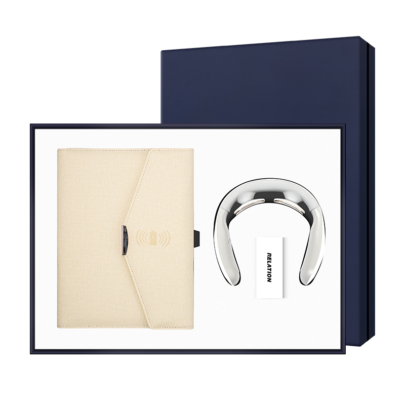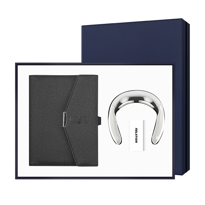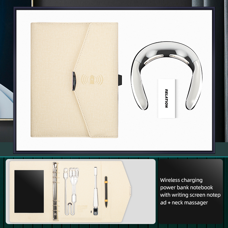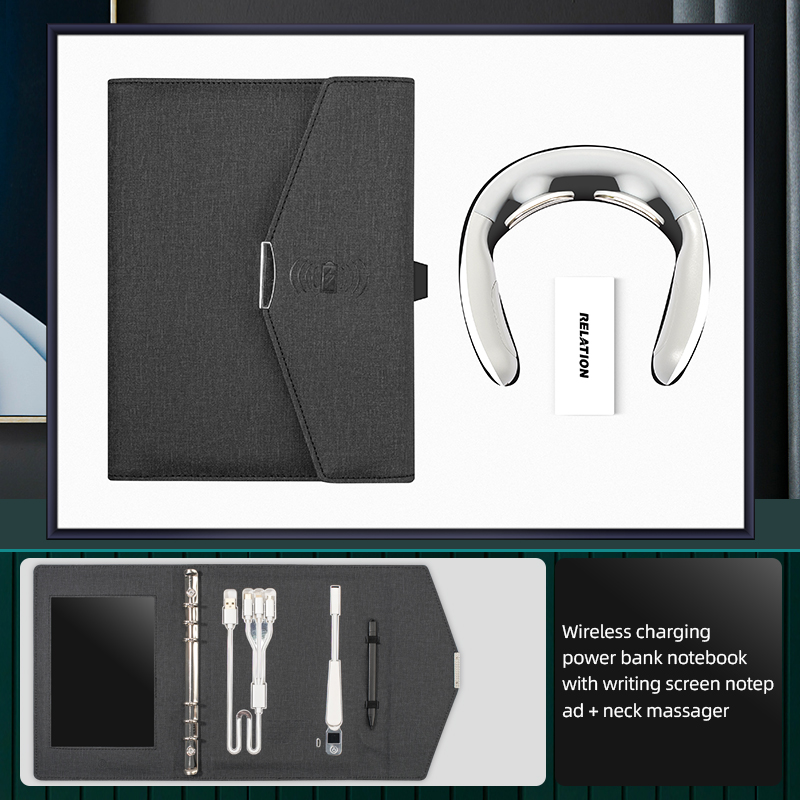 Power bank notebook:Big writing screen notepad, wireless & cable charging, LED lamp, storage, 12000mahNeck massage:4 massage modes & 15 levels, low pulse, constant temperature hot compress, 2.5W, 150*145*45mmColor:Black, beige